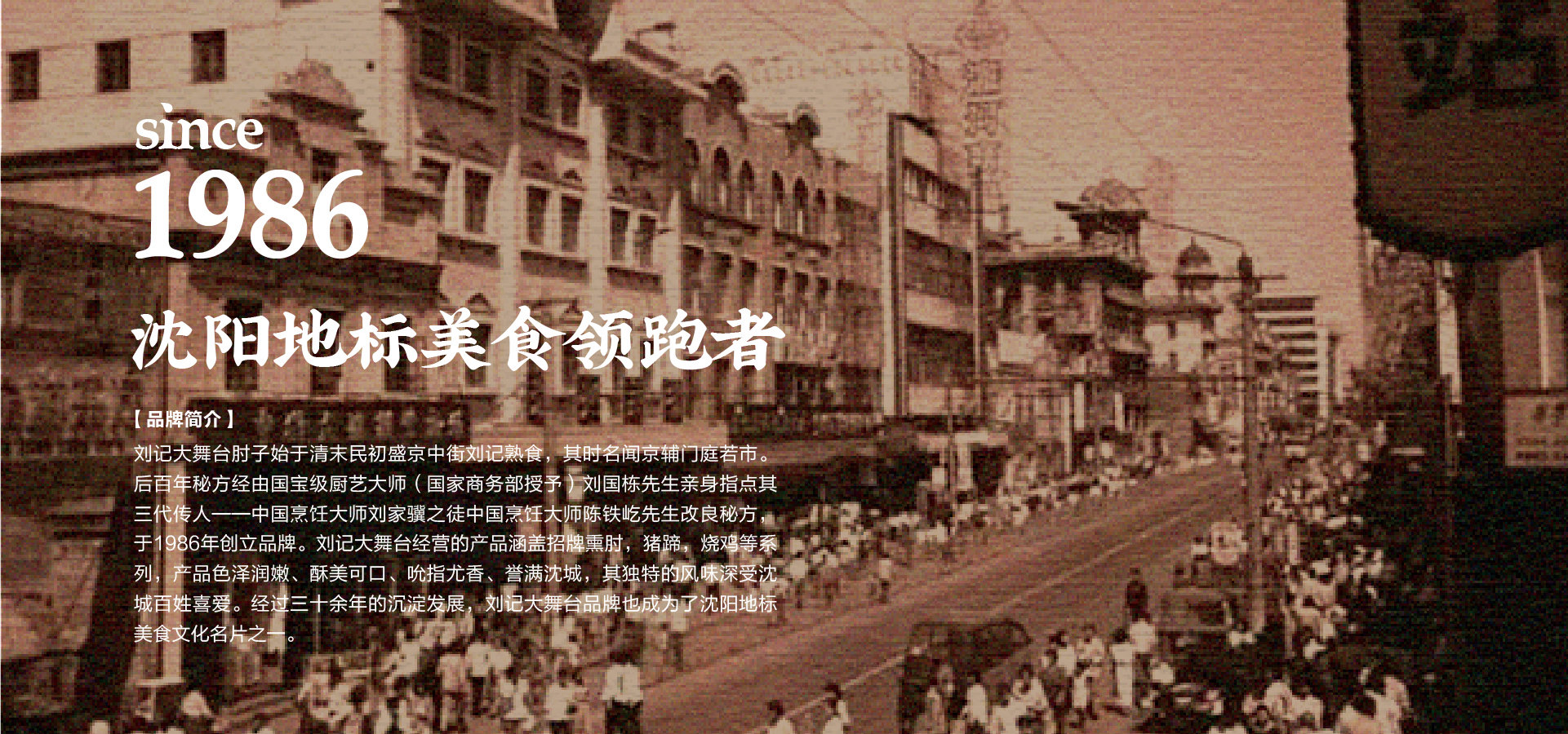 品牌創(chuàng)始人陳鐵屹先生自幼師承遼菜正宗,以發(fā)揚傳承遼味為己任。1986年,陳鐵屹先生經(jīng)師傅指導調(diào)制出第一鍋醬湯,自此開始制作熟食,并于市井銷售,食客絡(luò)繹不絕。作為中華美食的傳承者、開拓者和創(chuàng)新者,陳鐵屹先生于80年代創(chuàng)立“劉記大舞臺肘子”品牌,開出了第一家門店。基于百年秘方傳承改良,并采用新鮮放心原料,秘用二十幾味名貴藥材,延用傳統(tǒng)工藝專心加工而成,形成了色澤艷麗,酥爛脫骨,肥而不膩,瘦而不柴的風味產(chǎn)品。